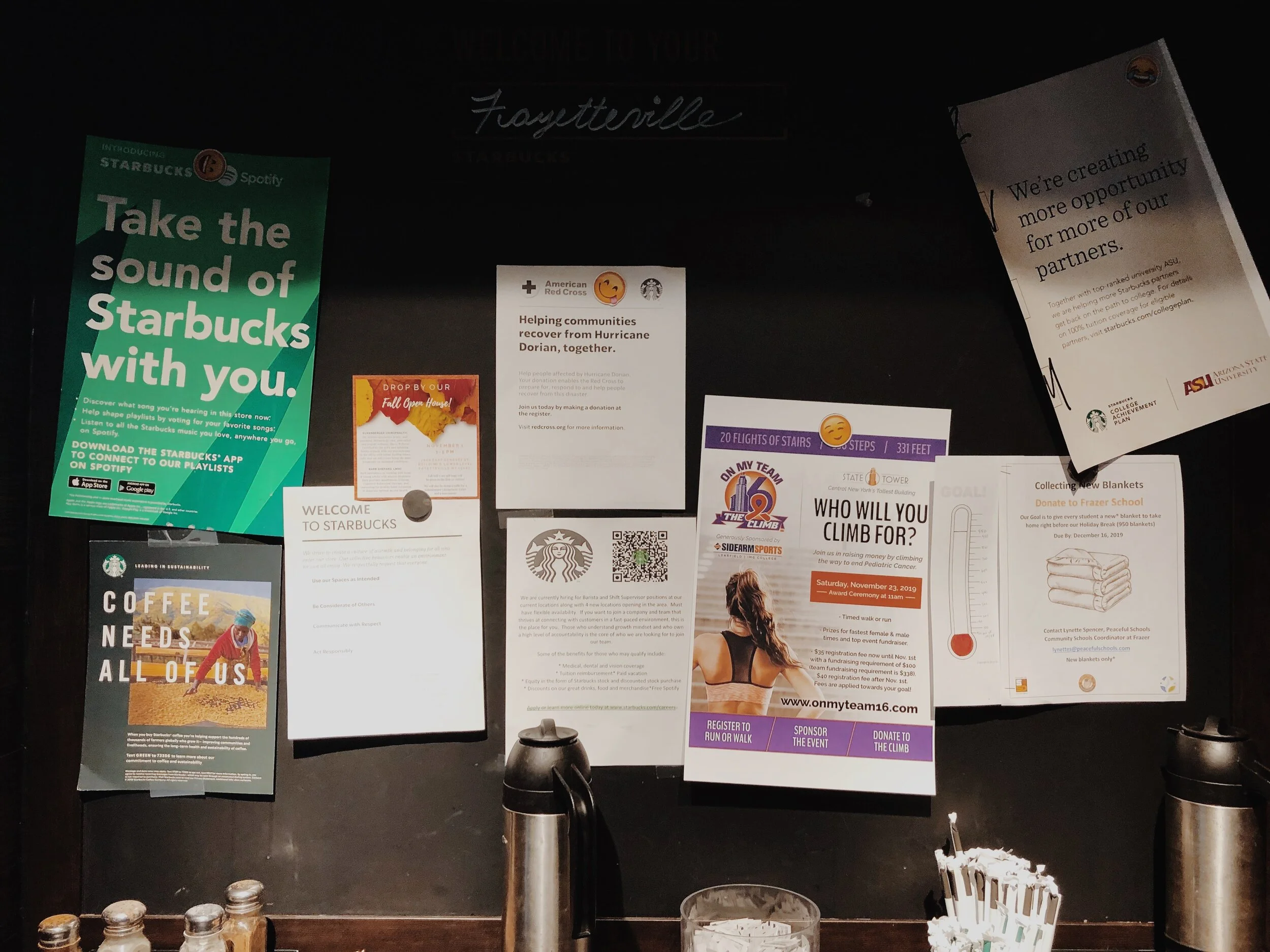On my way back home one day, a small woman with brown curly hair stands by the bulletin board at the entrance. She works with military precision and efficiency. A messenger bag lays at her feet, a cup of coffee waits for her at the counter, and a little boy with matching hair circles her legs.